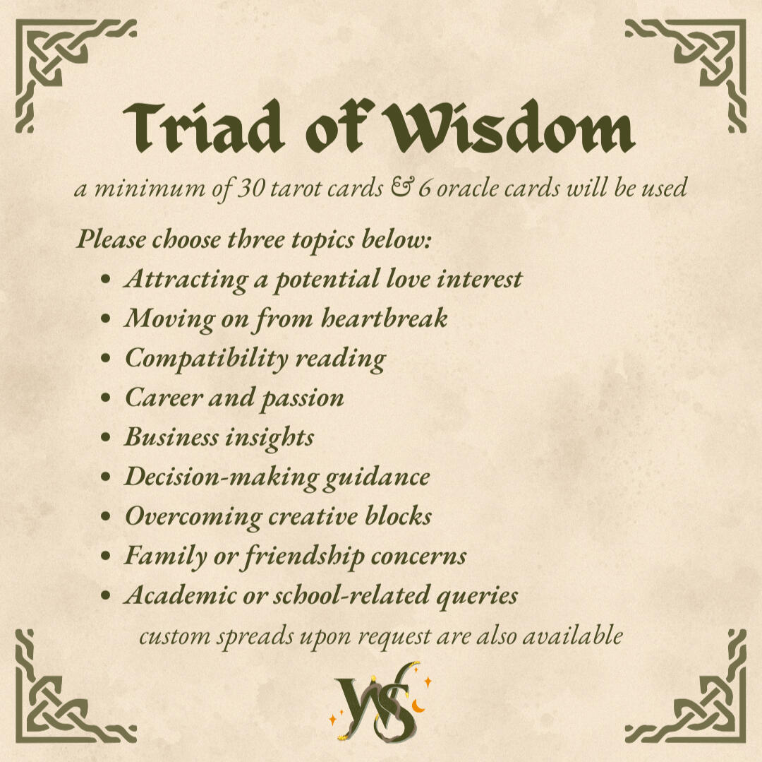 A comprehensive reading designed to delve into three distinct areas of your life, providing deep insights and guidance on each. Perfect for exploring multiple aspects of your journey or tackling complex concerns.READING FORMAT: