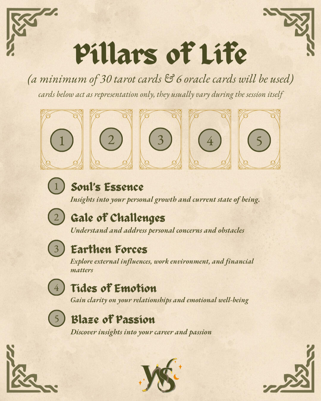 A general reading overview of 5 areas of your life: Spirit (self), Air (personal Problems), Earth (External Influences and/or finances), Water (Emotions or Relationships), Fire (passion/career)READING FORMAT: