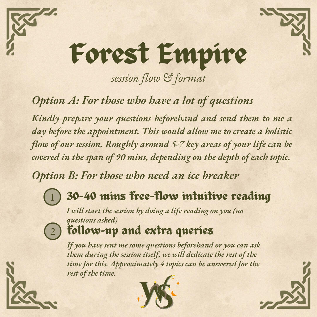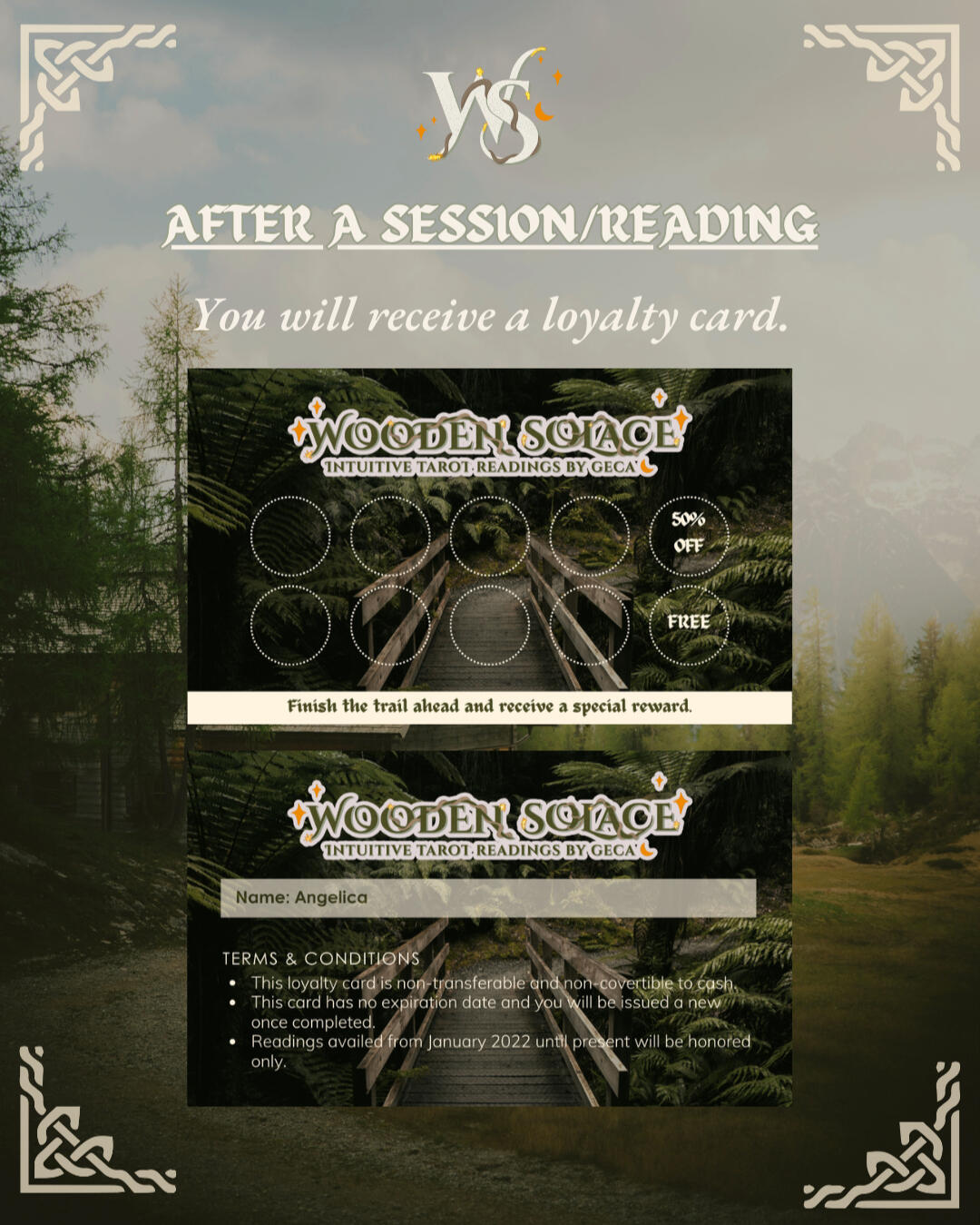 | Reading Boundaries | The client must respect my reading boundaries. My shop only accepts scheduled appointments and I value my clients who have patiently waited for their slots. Therefore, no same-day readings or walk-ins, unless stated otherwise. |