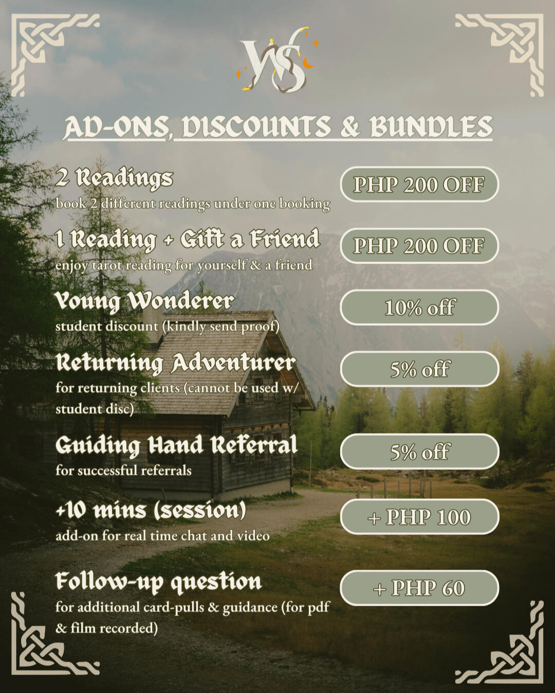 | Step 1 | Check rates, reading inclusions, and format of delivery before booking. If you have any questions, feel free to send inquiry through the contact tab or via Instagram DMs |